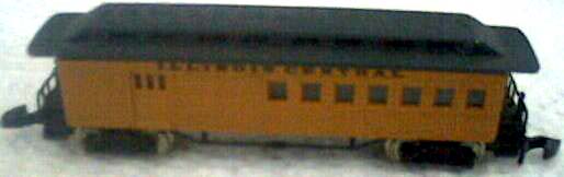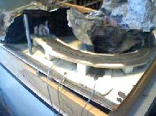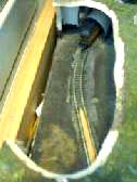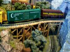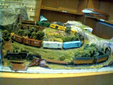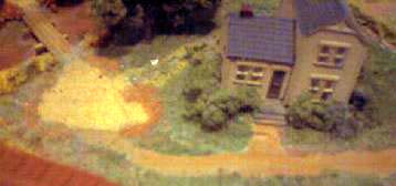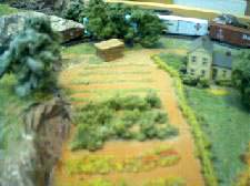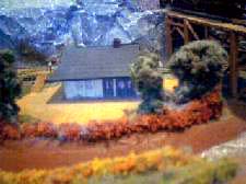 | Not much to say about the farm house. It's another Marklin. I tried to show the walkway and flower gardens, but couldn't get them to show up well. No lamp posts here, but note the wood bridge across the stream. | The garden was easy. You just paint the ground "dirt" then when it dries paint a line of dirt and sprinkle plants in it. The shed and a picnic table had to be built from scrap "lumber". | A mountain sits here unless a train gets stuck. To reduce that I put in a custom re-railer. |