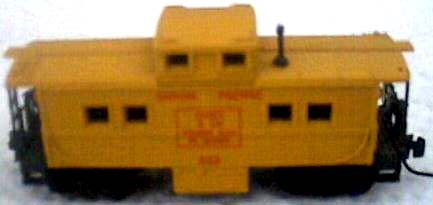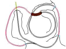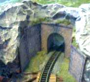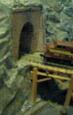 | The first step after assembling the materials was to arrange the track and mark its location on the foam board. This image is not to scale but shows the locations of trestle, tunnels and the burried siding end. | This shows basic construction. The bottom foam board was left whole as a lightweight layout base. Then I cut a second foam board about 3x the track width for the bed. You can see that I use the paint for glue. | This shows the results of the printed masonry and