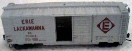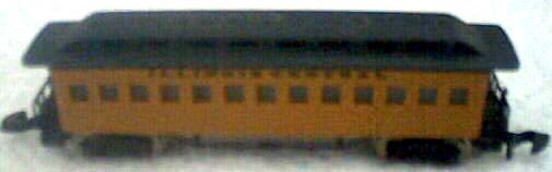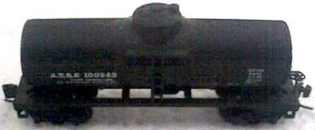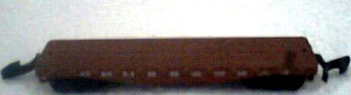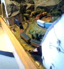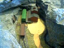 | A closer view of the station. When I built this layout, the only affordable buildings were the Marklin blocks of cast rubbery plastic. I couldn't put lights in them, but I did manage to paint the windows, doors, roofs and chimneys. | This view, in addition to a clear look at my one turnout, shows the switches I installed to control it. Again the wires are grooved in to the bottom of the table. I was planning to build my own super throttle control. | This is the blind canyon that the spur line runs into.there's another painted building from Marklin with another lamp post. Note also the man-sized mine entrance and the barely visible sluice used to supply "water" to the factory. |