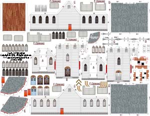 sheet, you will see that there are parts here for two churches except for the floor. A second floor is provided on the "interior" sheet. The three main parts (the tower, front wall and wrap-around walls)